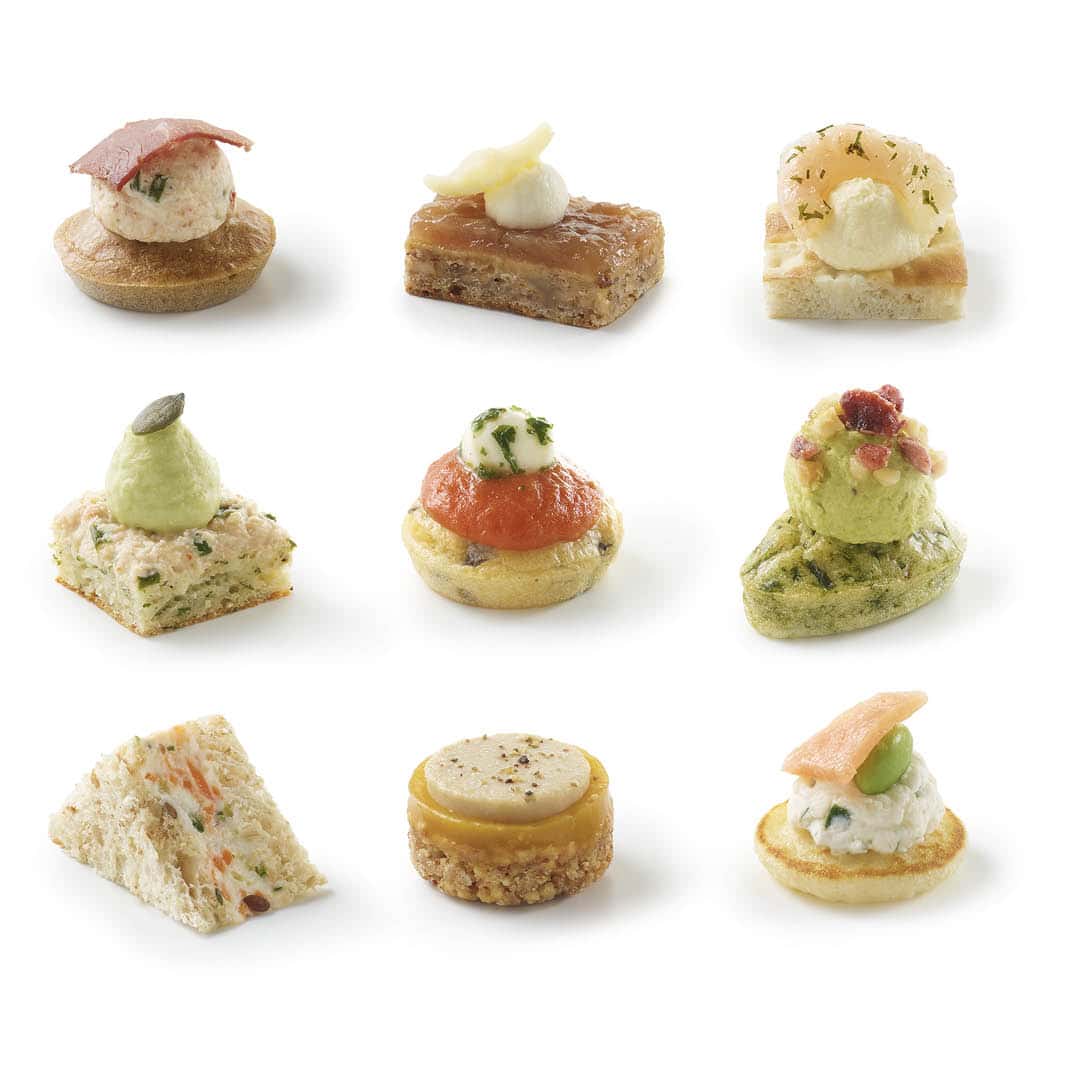 Ce nouvel assortiment de 54 pièces se compose de 9 recettes variées, alternant bouchées terre, mer et végétariennes. Ces pièces gourmandes sont élaborées à partir d’ingrédients naturels et nobles, rigoureusement sélectionnés : foie gras, saumon fumé, crevette rose, magret de canard ou encore comté AOP. Elles séduiront vos invités par leurs recettes emblématiques du terroir Français.