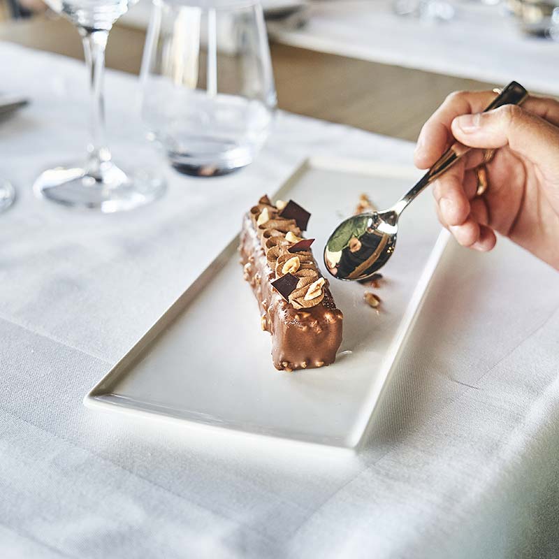 Le Rocher Chocolat Noisette s’intègre parfaitement à la carte d’un professionnel de la restauration commerciale ou de la restauration hôtelière. En effet, ce dessert chocolaté est un entremet d’exception. Le croustillant se compose d’un mélange de chocolat et de brisures de crêpes dentelle. Une fois le lingot cristallisé, il est enrobé de chocolat fondu et d’éclats de noisettes.