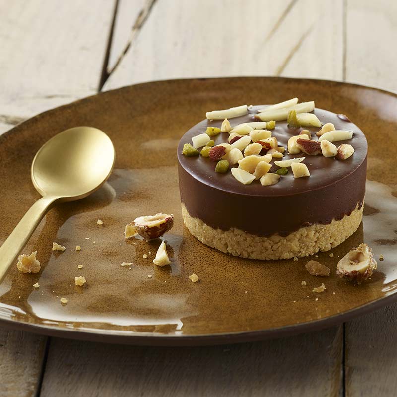 • Sa recette du mendiant revisitée, avec sa base crumble pur beurre et ses éclats de noisettes torréfiées